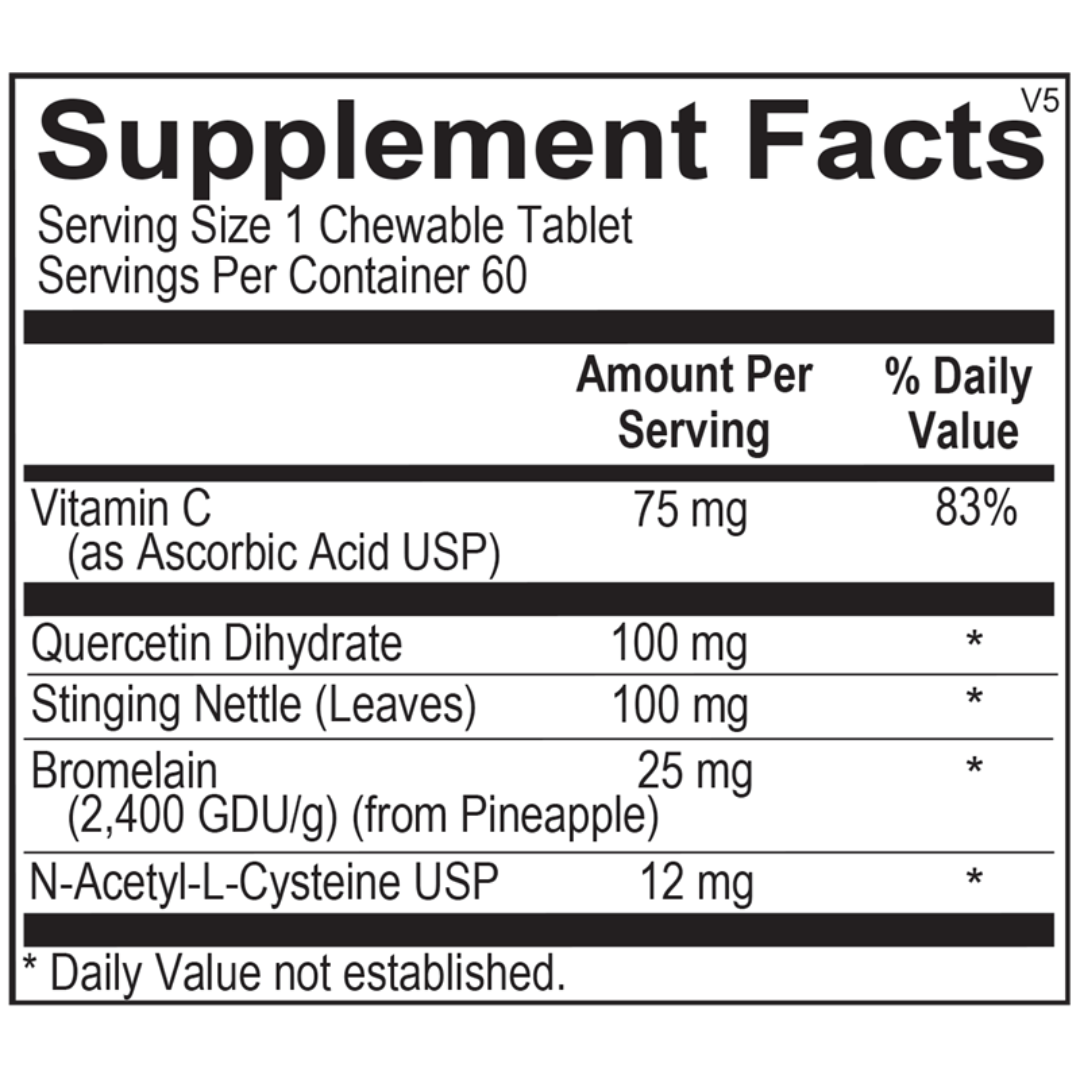 D-Hist Jr.™ is a great-tasting, chewable tablet that includes a targeted blend of flavonoids, antioxidants, proteolytic enzymes and botanicals designed to provide comprehensive support for children with seasonal challenges caused by common environmental allergens. D-Hist Jr.™ includes quercetin, a powerful flavonoid to support healthy histamine levels. It supplies bromelain to enhance the absorption of quercetin and support mucosal tissue health, and stinging nettle leaf to balance hyper-immune responses. N-acetyl-cysteine clears the airways by promoting normal viscosity of mucus. This unique nutritional combination safely promotes healthy nasal and sinus passages for children with elevated histamine and respiratory irritation.
